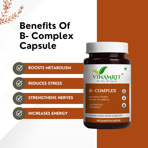 Vinamrit Vitamin B-Complex Tablets deliver a complete daily dose of essential B vitamins along with Lactobacillus Acidophilus, a probiotic that supports gut health and nutrient absorption. This powerful blend helps convert food into energy, supports the nervous system, enhances brain function, and promotes healthy skin, hair, and nails. Each capsule provides 100% of your daily B-vitamin requirements, making it the perfect choice for those seeking more stamina, focus, and inner vitality. Crafted with 100% vegetarian ingredients, this formula is ideal for both men and women.