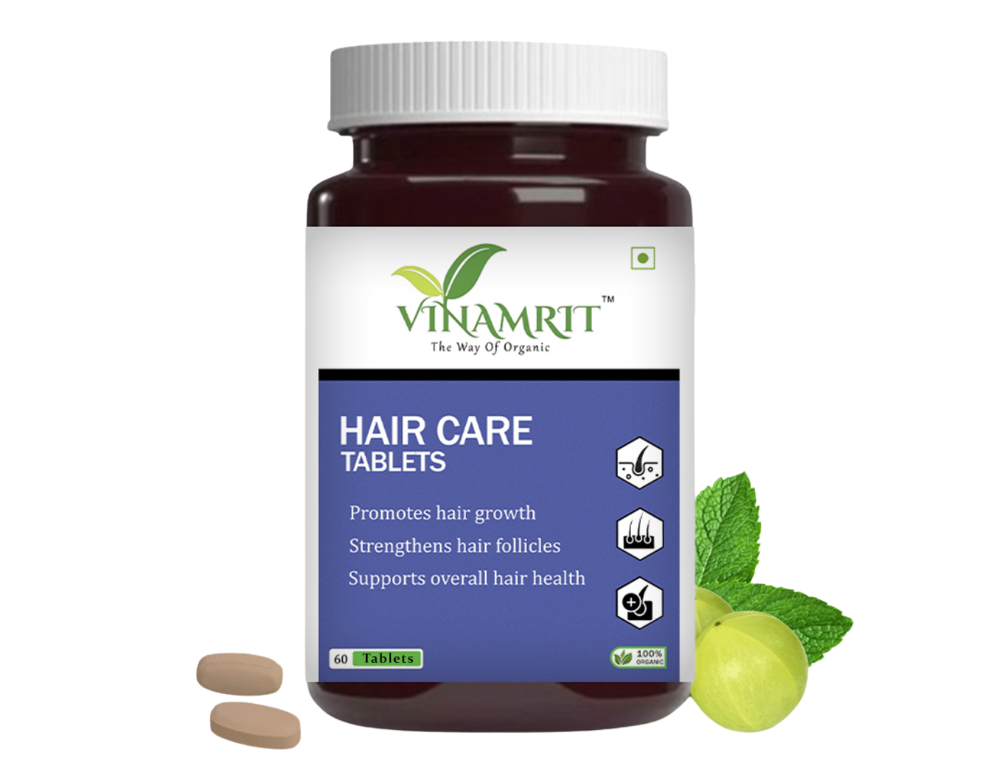 Vinamrit Hair Care Tablets: Harness the power of ancient Ayurvedic ingredients like Guggulu, Amla, Haritaki, and Bibhitaki to promote healthy hair growth and scalp nourishment.